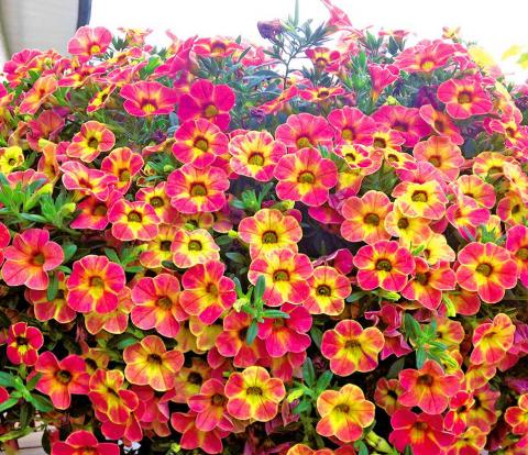 Саженцы калибрахоа Саншеин Берри (Calibrachoa Chameleon Sunshine Berry) – ампельный куст с яркими цветочками-хамелеонами интенсивного желтого и ало-розового цвета.
