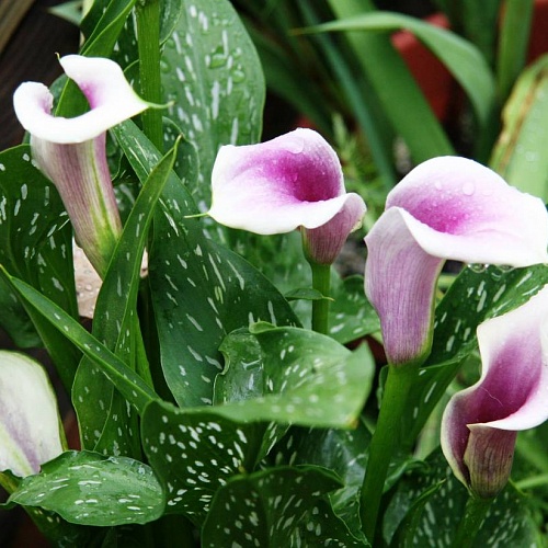 Необычная расцветка этого тропического растение привлечет внимание любителей цветов – шикарная Калла Пикассо (Calla Picasso) обладает необычайном окрасом. В глубине белого бутона затаилась синева ночного неба, по листьям растения рассыпались белые капельки крапа. Растение настолько декоративно, что сразу же привлекает внимание. Выращивать этот сорт можно в открытом грунте и горшках, любит обильный полив. Предпочитает немного затененные места, хорошую почву и дренажом. В открытый грунт высаживается только после последних морозов. После цветения желательно удалять лишние листья. Красива в одиночных посадках и клумбах.