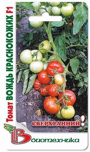 Семена томата "Вождь Краснокожих F1" (Vozhd Krasnokozhikh F1) относятся к среднераннему сорту. Между появлением первых всходов до начала созревания проходит примерно 80-85 дней. Кусты низкорослые, в высоту не более 60 см. Плоды округло-плоской формы, кожица гладкая, красного цвета. Средняя масса достигает 700 грамм. Помидорки очень красивые, сладкие, плотные, мясистые. Сорт исключительной урожайности и отличается стойкостью перед многими болезнями. Плоды салатного назначения, используется для потребления в свежем виде и переработки.