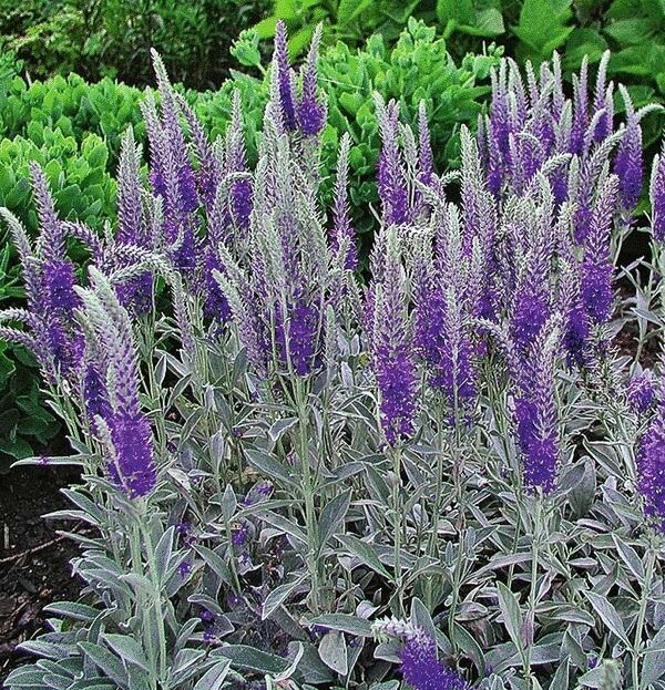 Рассада вероники седой Silberteppich используется чаще всего в групповых и смешанных посадках среди камней, для оформления бордюров, миксбордеров. Многолетник хорошо растет как на солнце, так и в тени. К почве культура не требовательна. Главная особенность вероники седой Silberteppich – сизый оттенок яйцевидных листочков. Побеги прямостоячие, толстые, высотой около 20-40 сантиметров. Цветет многолетник длинными свечеподобными соцветиями сине-фиолетового окраса. Они эффектно выделяются на фоне листвы и радуют цветением на протяжении месяца.